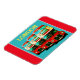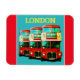 Imã de geladeira com design horizontal mostrando uma foto tratada digitalmente do antigo estilo dos ônibus de Londres, duplicada três vezes em um fundo vermelho e lacrado. Um souvenir excelente de Londres para levar para casa ou colocar na sua cozinha.