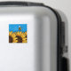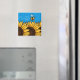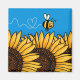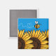 uma abelha fofa sobre uma fileira de girassóis e deixa um rastro em forma de coração sobre este ímã alegre e colorido
