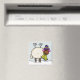 "Ovinos de inverno" - parte da série "Ovinos de todas as estações". Um carneiro giro com chapéu, cachecol e ouvidos-aquecedores está parado na neve como sempre acompanhado por duas aves.