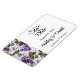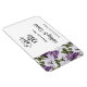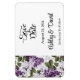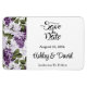 O ímã de salvar a data é mostrado em um layout formal clássico na cor branca com texto preto e texto em itálico destacando os nomes da Noiva e do Noivo e acentuado com uma linda estampa floral de lilases.
