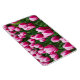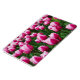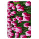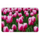Ímã mostrado com uma impressão fotográfica de um campo de tulipas rosa bonitas. Tamanho 4x6. Imagem de estoque