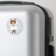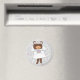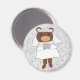 Um urso pardo vestido de noiva, pronto para o seu casamento, segura um buquê de flores cor-de-rosa contra um fundo roxo multicolorido num ímã
