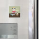 Um pequeno ímã de geladeira fofo com uma vaca de desenho animado (chamada Snowbell) pintando alguns ovos de Páscoa. O texto diz "Felz pascoa!" Mas sinta-se à vontade para substituí-la pela sua.