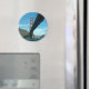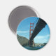 Torre norte da Ponte Golden Gate contra o céu azul profundo. Um grande navio está se aproximando da ponte abaixo.