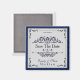 Imã salve a data para o frigorífico indicada. Esta é quadrada e mostrada em um tema azul-safira, cinzas-prateadas e vegetação negra florescem. Texto pré-formatado para personalizar com nomes e data. Personalize este item e altere o texto para o seu. Imagem do stock freepik.com