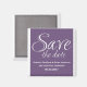 Imã salve a data de caligrafia em roxo e branco com design de tipografia sofisticada. Esta imã salve a data elegante e chic é fácil de personalizar com seus detalhes de casamento. Para obter mais opções de personalização, clique no botão Personalizar Ti.