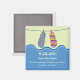 Imã salve a data divertida e moderna com um tema de praia. Excelente para um casamento de primavera ou verão. Ideal para uma praia ou casamento ao ar livre. Apresenta chinelos com diferentes padrões pendurados numa linha de roupa e ondas oceânicas no fundo.