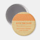 Imã salve a data Rustic Chevron moderna e moderna, com uma arte digital imprimiu fundo de textura de madeira e um padrão zag de faixas laranja-córneas. Esta design é perfeita para anunciar um casamento rústico mas elegante. Fácil de personalizar, simplesmente adicione seus detalhes de casamento. Clique em "Personalizar" para encontrar mais opções de personalização.