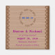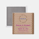 Uma mistura de feminina e rústica, esta imã salve a data única apresenta um lugar marrom contra um fundo de madeira e os detalhes do casamento escritos em marinho e magenta.