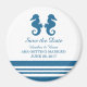 Imã salve a data Elegante e clássica de Cavalo-Marinho Náutico com um par de cavalos-marinhos simples e um conjunto de faixas em azul e branco marinho escuro. Esta imã salve a data do tema da praia náutica pode ser facilmente personalizada com seus detalhes de casamento. Para obter mais opções de personalização, clique no botão Personalizar Ti.