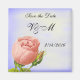Uma Imã salve a data com letras de script e espaço para o seu texto personalizado, decorada com uma rosa rosa bonito com uma pequena rosebud apenas começando a abrir sobre um fundo creme e azul-céu.
