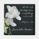 Uma imã de geladeira bonito 'Salve a Data' para você personalizar, com um spray de freesias brancas sobre fundo preto, a partir de uma fotografia de Judy Adamson