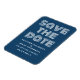 Imã salve a data retrorativa em azul e branco com uma design de tipografia moderna funky. Esta tendência e imã salve a data de na moda é fácil de personalizar com seus detalhes de casamento. Para obter mais opções de personalização, clique no botão Personalizar Ti.