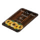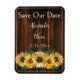 Anuncie seu próximo dia de casamento para a família e convidados com uma Imã salve a data Rústica de Girassol. Design de ímã apresenta um fundo de madeira rústico com um buquê elegante de girassóis. Personalize com os nomes do noivo e da noiva junto com a data do casamento. Papelaria de casamento e presentes disponíveis com esta design também.