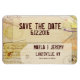 tema viagem em creme e fundo bronzeado. Mapas antigos, marcos, selos e etiquetas decoram este íman de casamento de "salvar a data". Fácil de alterar Salve o texto Data com o nome da noiva e do noivo, data e cidade. Alguns estilos de fonte mostrados, inclusive antigos, sem script, mas podem ser facilmente alterados para se adequarem ao seu próprio estilo de "salvar a data".