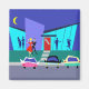 Este Retro Open House Party Magnet colocará-lo-á no clima de festa. O design de desenho mostra o exterior de uma casa moderna de meio século. Através do chão até as paredes de vidro de turquesa no teto, podemos ver as silhuetas azuis marinhos de gajos festivos. Há um casal conversando em frente a uma janela. Do lado oposto da sala, podemos ver um homem dançarino e o homem de longa-ventura que todos estão tentando evitar. O exterior da casa tem uma porta vermelha alegre e uma chaminé roxa de tijolo sobredimensionada. Uma passagem de cinza está cortando uma faixa até a porta da frente, através da grama da floresta. A cena noturna tem um céu azul escuro com uma lua amarela e crescente. Um casal atraente está fazendo o cha-cha-cha a caminho do carro. A loira está vestindo um vestido vermelho brilhante. Sua escolta bonita está vestindo um terno preto e uma gravata vermelha. As mãos dele estão envoltas na cintura da mulher. Na rua, em frente à casa, podemos ver três carros clássicos de cor brilhante. Peça hoje e festas como se fosse 1959!
