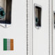 Imã de geladeira, com a bandeira triangular irlandesa na textura de uma prancha de madeira.