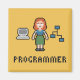 Ilustração de arte de pixel retratando um programador feminino, um computador e um fluxograma.