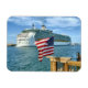 Cruzamento a partir de Port Canaveral, um grande navio de cruzeiro vai para o mar, enquanto a estrela derramou o símbolo da liberdade flutters no primeiro plano como se acenasse uma boa viagem aos cruzeiros a bordo