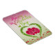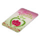 con fondo verde y rosa degradado y hojas de rosas en la parte inferior y un corazón verde de purpurina.