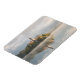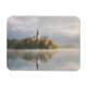 Foto magnética retangular de souvenir de um nascer do sol nebuloso no lago Bled com a ilha com igreja e névoa com reflexo na água, à luz do sol da manhã na Eslovênia.