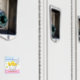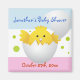 Um pintinho eclodindo no centro da imagem. O banner superior em azul-claro com texto personalizável e o banner rosa inferior com texto de data personalizável.