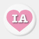 Este ímã apresenta um coração cor-de-rosa vibrante contendo as letras maiúsculas, brancas e em negrito IA, a abreviação oficial de Iowa, o estado de olho-de-gavião.