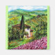 Paisagem da Toscana, colorida, vibrante e expressiva beleza dos campos italianos e da íris violeta púrpura, bela flora de Verão em verde claro, amarelo, castanho, azul, branco, prados, campo de flores, ciprestes e oliveiras, antiga casa de fazenda rústica sob o céu azul e nuvens brancas. Pintura acrílica em canvas.
