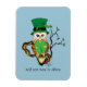 Uma coruja de celeiro giro vestindo chapéu verde de duende com dois telhados.