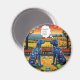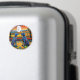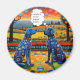 Dois cães azuis com padrões coloridos são mostrados sentados em uma paisagem brilhante e vibrante, repleta de céus giratórios e colinas ondulantes. Uma bolha de pensamento sugere uma conexão caprichosa entre eles.