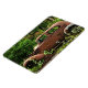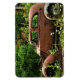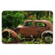 Este ímã flexível apresenta um pobre jalopy viciado deixado para ferrugar na floresta. Está cercado por árvores verdes e flores silvestres brancas. Há uma certa beleza e dignidade a este velho e enferrujado carro laranja, castanho e azul.