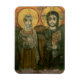 Uma imagem do século 6 ou 7. Trabalho de arte sobre um fundo dourado que representa um Cristo com uma Bíblia grande. O Salvador e o Abbot/Monk têm olhos castanhos grandes.