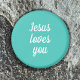 Você pode personalizar este ímã "Jesus ama você" escrito em um moderno e elegante roteiro branco sobre o fundo verde aqua. Este botão de tendência de na moda pode ser personalizado com um nome ou outra palavra-chave. Também pode ser encomendado a granel, como é o caso de ocasiões baratas. Seria um presente excelente para truques, travessuras ou sanduíches ou páscoas. Pretende-se encorajar as crianças e os adultos a serem amados pelo seu Pai celestial com um amor eterno. Veja outros designs nesta coleção de expressões cristãs e de ditados religiosos. Excelente de uma igreja cristã ou de senhoras religiosas, presentes na escola de domingo, favores da escola de Bíblia.