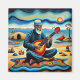 A.I. criou impressão de um homem barbudo vestindo um chapéu em um tapete colorido, tocando um instrumento de corda Bouzouki por uma praia surreal com padrões vibrantes e girantes. A paisagem apresenta formações rochosas incomuns, um sol brilhante e um mar calmo.