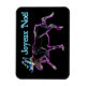 Uma representação brilhante e neonatal de um alce num fundo preto. O texto francês que lê "Joyeux Noё l" aparece em azul e branco brilhantes.