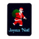 Você acredita em Papais noeis? Imagem de um Papai Noel (Père Noël), carregando de presentes verdes, sobreposta a um fundo estrelado. O texto francês que lê "Joyeux Noё l" aparece em azul e branco brilhantes.