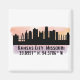O ímã quadrado apresenta uma silhueta de linha do horizonte de Kansas City, MO com coordenadas de mapa em um fundo de abertura de cor d'água.