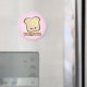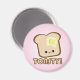 Um ímã giro com um pedaço sorridente de torrada com manteiga derretida acima da palavra tosta! Em Bauhaus 93. Um doce café da manhã para fãs de humor kawaii!