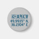 Design de ímã moderno apresenta coordenadas de latitude e longitude para Kharkiv, Ucrânia com uma fonte azul escuro angustiada sobre fundo de cinza