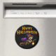 Of enchantment to your kitchen locker or office with this magical tabby witch kitten round fridge magnet this delightful accessory features and adorable tabby kitten and a purple witches hat and cape soaring through the night on her broomstick with a glowing lantern set against a deep black background with a bold golden happy Halloween greeting this high-quality magnet is the perfect way to display your holiday spirit
