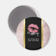 Imã personalizado de negócios com fundo composto por um padrão moderno de folhas tropicais de rosa de ouro. A camada superior é uma estrutura preta com borda de gradiente dourada, dentro são lábios brilhantes cor-de-rosa.