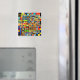 A vibrant geometric pattern, filled with colourful squares and rectangles, is overlaid with an intriguing sentence composed of words in various fonts and colours.