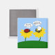 Neste ímã giro, uma abelha desgastada se senta sobre uma flor amarela e pergunta, "Por que você está me incomodando, senhora?", ao qual a joaninha esmagada sentada em outra flor responde, "Bee-Causa você é bonita". Da minha imagem original criada digitalmente.