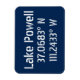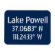 Coordenadas do mapa GPS Latitude e longitude para a popular zona de recreio ao ar livre do lago Powell, que faz fronteira com Utah e Arizona. Fonte branca moderna e urbana sobre fundo azul escuro.
