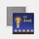 Feliz Ilustração Diwali: uma lâmpada brilhante Diwali com diyas vermelhas (lâmpadas de óleo índio em forma de xícara) com uma fronteira ornamental sobre fundo noturno do céu e a saudação escrita em Sânscrito.