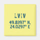 O design de ímã moderno apresenta coordenadas de latitude e longitude para Lviv, Ucrânia com uma fonte azul escuro angustiada sobre fundo amarelo