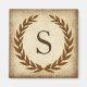 Uma delicada coroa de louros é colocada sobre um fundo de papel antigo no estilo clássico romano. Esta design é personalizada com o monograma "S" em tom siena rico.