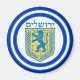Um ímã redondo com uma imagem de um leão azul e amarelo de emblema Judah e bordas azuis largas aparadas em azul claro em branco. Veja a coleção inteira de aníches de Hanukkah na seção HOLIDAYS.