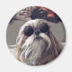 Personalize e personalize a ideia de presente dos amantes de cães divertidos. Engraçado fofinho, cadela branca e marrom, com nariz preto grande, cabelo comprido e óculos coloridos de sol da velha escola. Legal Shih Tzu deitado e resfriado no sofá e se posando como um profissional para um retrato.