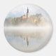 Redondo fotoímã com um nascer de sol nebuloso no lago Bled com reflexo da ilha com a igreja na água do lago e com o Castelo Bled ao fundo num belo dia de outono na Eslovênia.